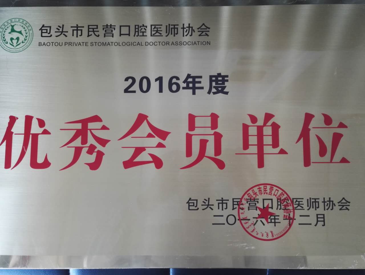 贾氏口腔高新店荣获2016年包头市民营口腔医师协会优秀会员单位称号。